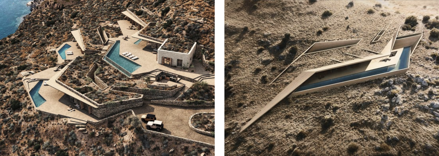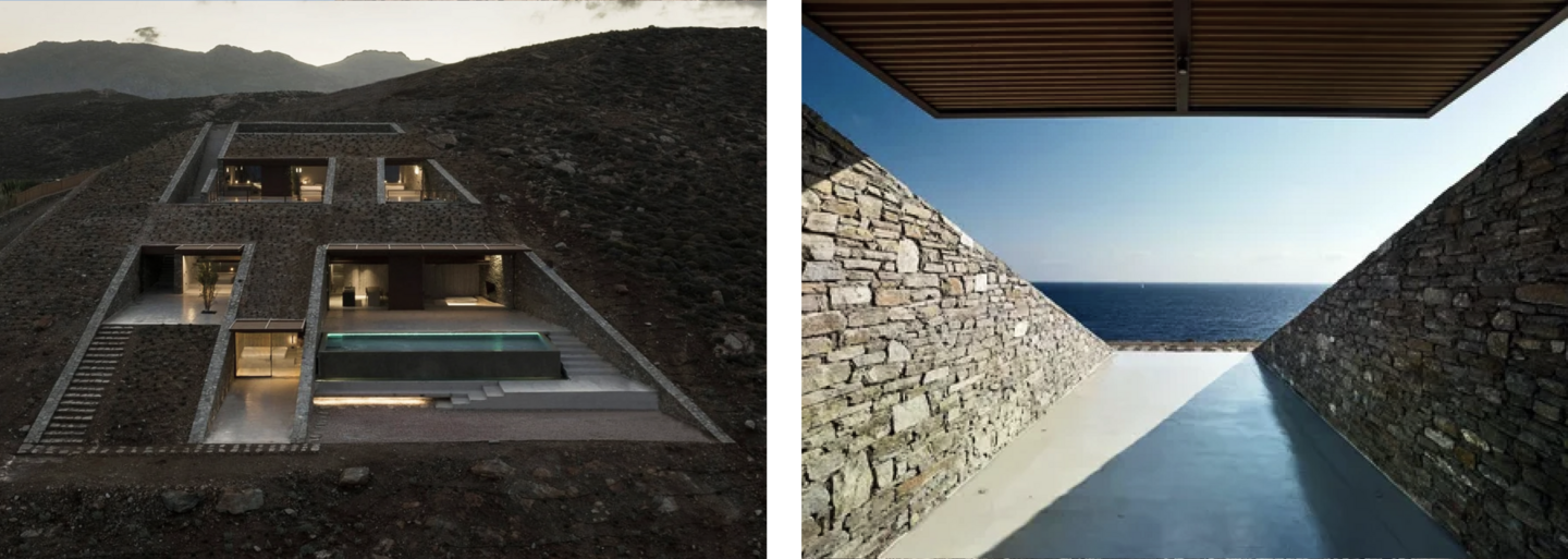 Здание использует стратегию «отрицательного пространства»: вместо того чтобы возводить объем над землей, архитекторы вырезали трехмерную сетку прямо в скалистом склоне. Это решение продиктовано не только эстетикой, но и суровым климатом — дом укрыт от сильных северных ветров «мельтеми». Фасады выполнены из сухой каменной кладки, добытой при раскопках котлована, что визуально растворяет границы объекта: издалека архитектура воспринимается как естественные подпорные стенки, типичные для греческого аграрного ландшафта, оставляя видимой лишь линию горизонта.