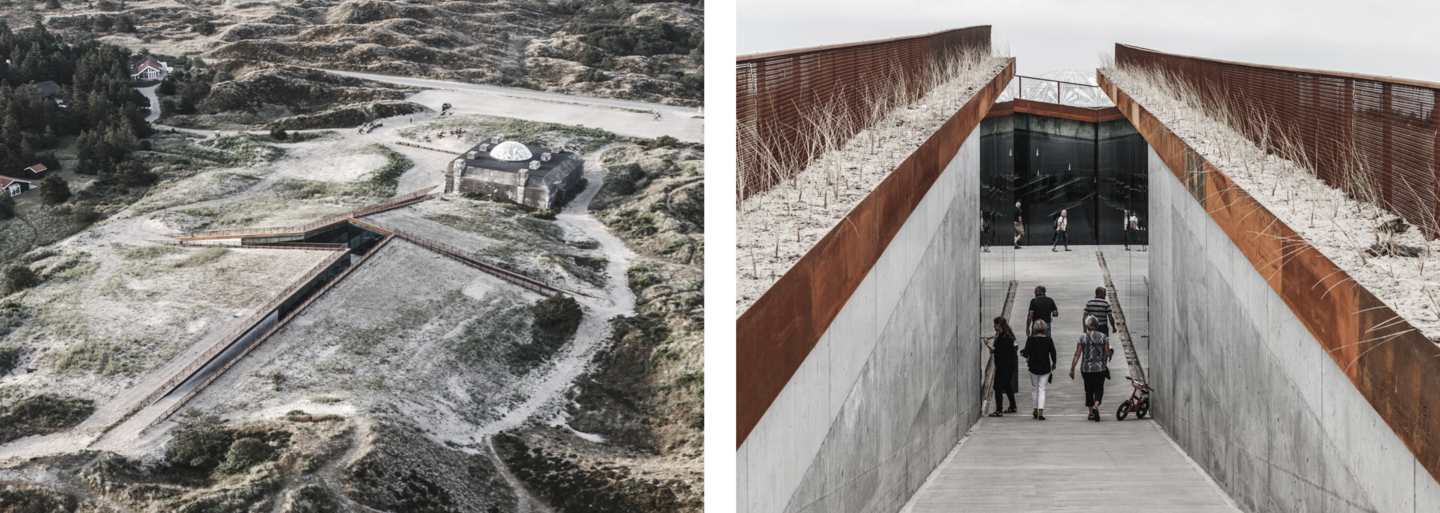 Проект реализует концепцию «невидимого вмешательства» в охраняемую природную зону. Музей представляет собой крестообразный надрез в существующей песчаной дюне, словно кто-то приподнял слой дерна и заглянул внутрь. Снаружи здание практически не существует — это лишь узкие прорези стекла и бетона, врезанные в холм. В отличие от стоящего рядом тяжелого бетонного бункера времен Второй мировой, новый музей воплощает легкость и открытость, скрывая свои масштабные выставочные залы под толщей песка и местной растительности, которая продолжает расти прямо на крыше.