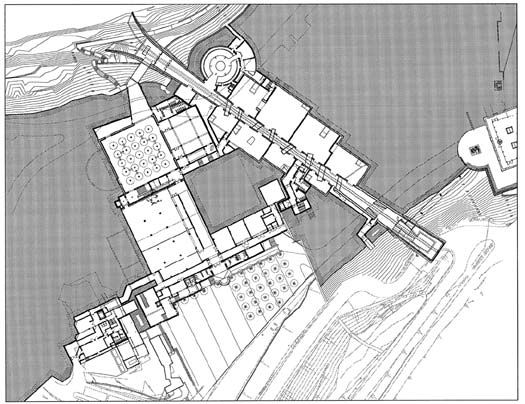 Вертикальное зонирование комплекса жестко продиктовано рельефом и отражает средневековую иерархию. У подножия, защищенного приливами и крепостной стеной, располагается город и рыцарский зал, выше — зона монашеской жизни, а на самой вершине — храм, устремленный в небо. Такая структура позволяла автономно функционировать разным слоям общества, используя ограниченное пространство острова с максимальной эффективностью.