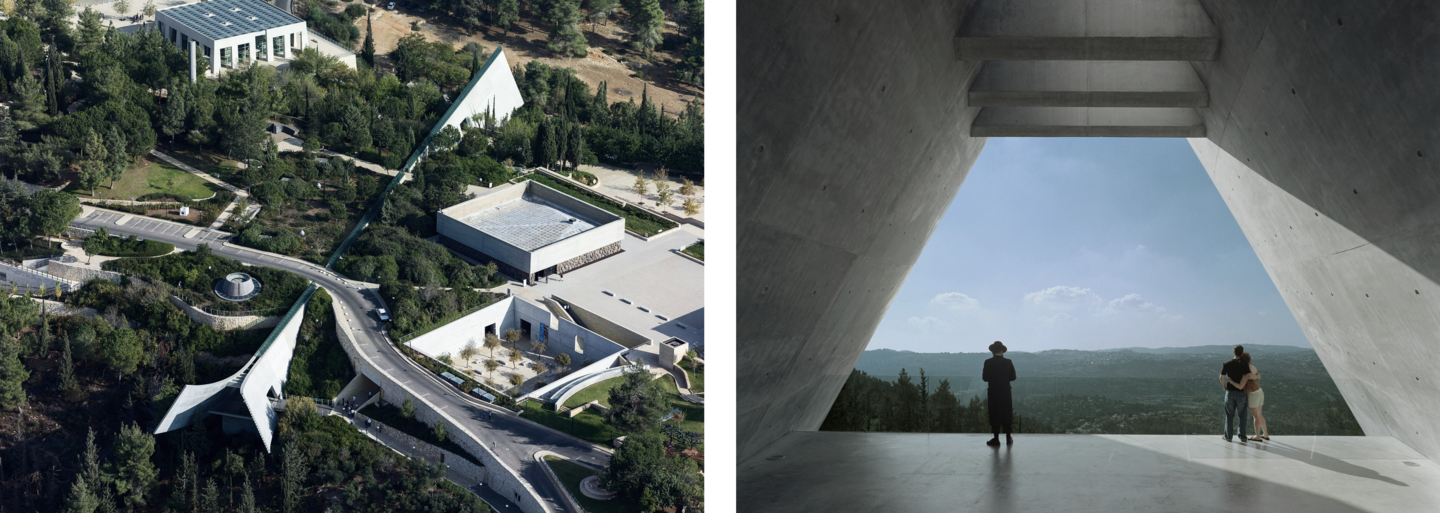 Здание интерпретирует ландшафт как драматическую преграду, которую нужно преодолеть. Архитектура представляет собой длинную бетонную призму, которая не огибает гору, а насквозь пронзает её, словно шрам. Большая часть музея находится под землей, лишая посетителя контакта с внешним миром, что создает давящую атмосферу. Интеграция здесь работает на драматургию: вход осуществляется в недра горы, а выход («свет в конце туннеля») происходит с противоположного склона, где консоль здания вырывается наружу, открывая панорамный вид на Иерусалим, символизируя надежду и возвращение к жизни.