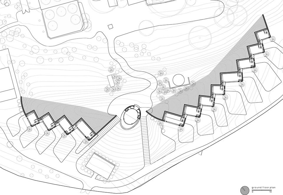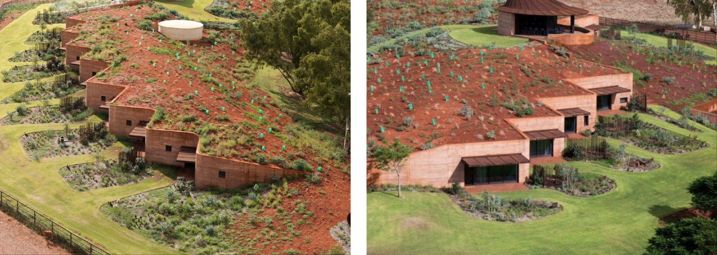 Здесь применена мимикрия через материал и форму. 230-метровая стена выполнена из утрамбованной земли (rammed earth), добытой прямо на участке, благодаря чему фасад идеально совпадает по цвету и текстуре с окружающей австралийской пустыней. Архитектура повторяет изгиб песчаной дюны, физически являясь её «подпорной стеной». Жилые модули заглублены внутрь насыпи, что позволяет использовать массу земли как естественный терморегулятор, сохраняющий прохладу в жару, превращая сам ландшафт в климатическую оболочку здания.