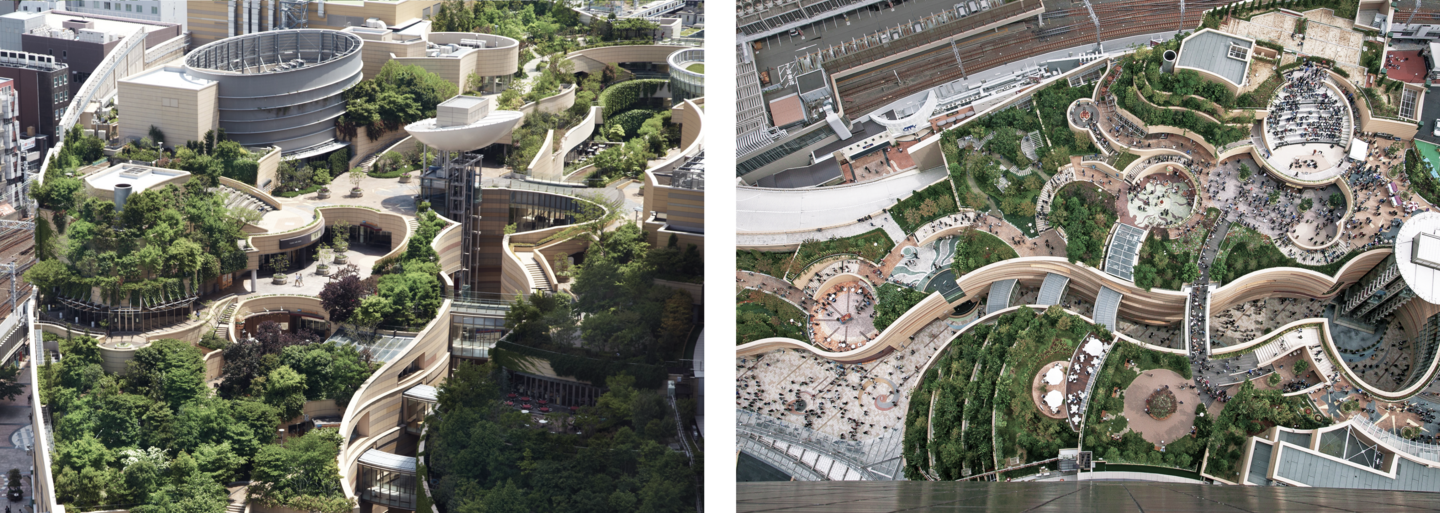 Это проект-манифест «городского каньона». На месте старого бейсбольного стадиона возвели огромный торгово-офисный комплекс, крыша которого представляет собой 8-уровневый каскадный парк. Террасы плавно спускаются с высоты 30-этажного здания до уровня улицы, имитируя природное ущелье. Каждая терраса — это отдельный сад с водопадами, скалами, лужайками и амфитеатрами. Здесь архитектура создает искусственную гору в центре мегаполиса, где посетитель, поднимаясь по террасам, забывает, что находится на крыше торгового центра.