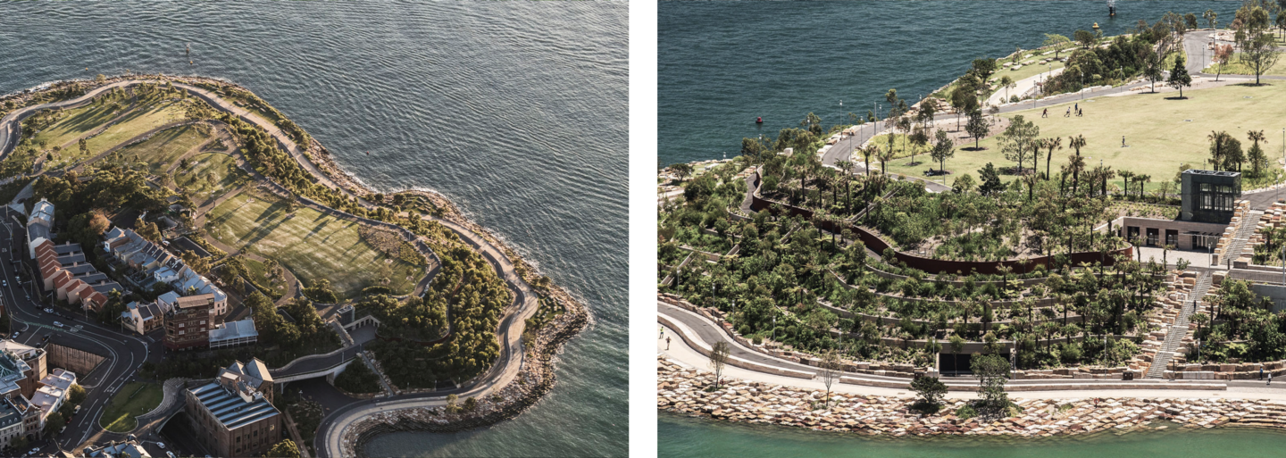 Реконструкция исторического мыса, который был уничтожен промышленным портом. Архитекторы использовали более 10 000 гигантских блоков местного песчаника, чтобы создать ступенчатый спуск к воде. Эти каменные террасы имитируют естественные слоистые скалы, характерные для сиднейской гавани. Террасирование здесь выполняет двойную функцию: укрепляет береговую линию и создает «приливные бассейны» (rock pools), которые заполняются водой во время прилива, возвращая жизнь морской флоре и фауне.
