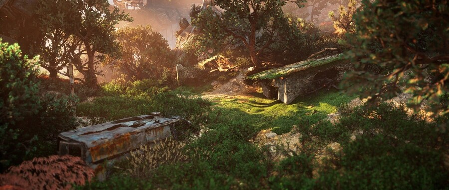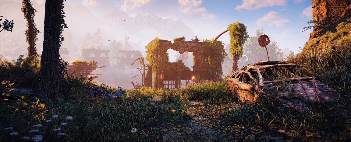 В эту категорию попадают не только стены зданий, но и любые недвижимые следы прошлого: забытый памятник, поросшая мхом скамейка или фонтан в глухой чаще. Натыкаться на такие объекты особенно волнительно из-за контраста: сейчас здесь царит абсолютная дикость и тишина, но архитектура свидетельствует о былом величии. Игрок понимает: здесь была другая культура, и лес хранит её отпечаток.