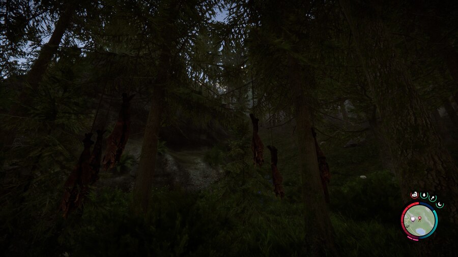 Частым дополнением временной стоянки становится палатка. Она очерчивает границы личного пространства, но эта защита иллюзорна: тонкая материя не способна стать барьером для настоящей угрозы. Ночью это ощущение уязвимости обостряется. Внутри светло, но стены не блокируют шум леса, из-за чего игрок оказывается в акустической ловушке: он не видит опасность, но слышит ее дыхание пугающе близко, прямо за тонкой тканью.