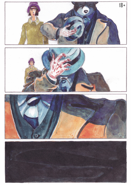Еще одним инструментом раскадровки является использование иллюстраций, занимающих всю полосу. В комиксе «Диптих» сразу за страницей, изображающей сцену на фронте при помощи небольших динамичных кадров, следует полоса с изображением новой локации — здания госпиталя. В данном случае полоса выполняет нарративную функцию и показывает переход повествования в другую локацию.