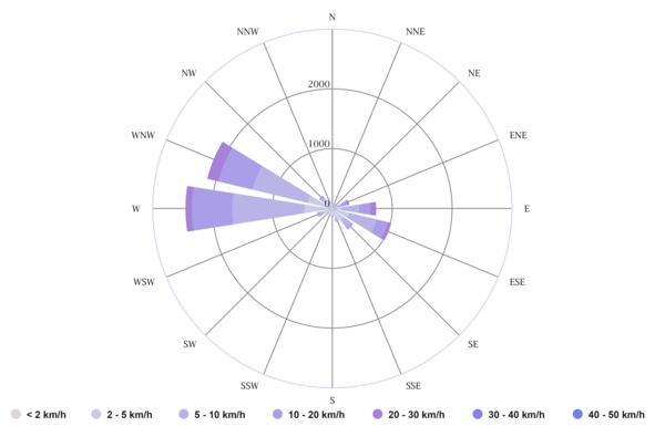 • Доминирующий вектор (WNW — Запад/Северо-Запад): Мощные холодные ветры с континента. На графике видно преобладание высоких скоростей (свыше 30–40 км/ч). • Вторичный вектор (ESE — Восток/Юго-Восток): Влажные ветры с океана, несущие штормовую погоду и осадки. • Общая динамика: Штилевые периоды редки, территория находится под постоянным ветровым давлением.