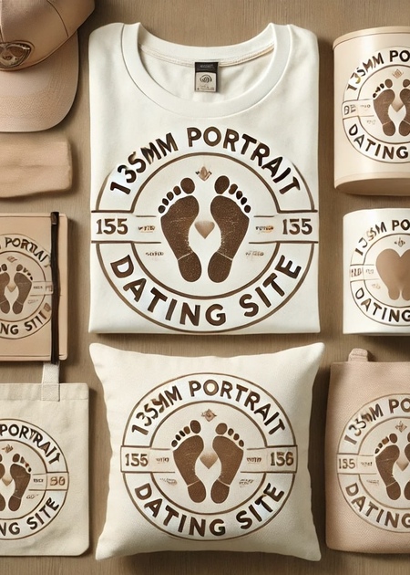 A collection of six items featuring a vintage-inspired logo with the text '135mm Portrait Dating Site' and a heart-shaped footprint design. The items include a white t-shirt, a ceramic mug, a notebook