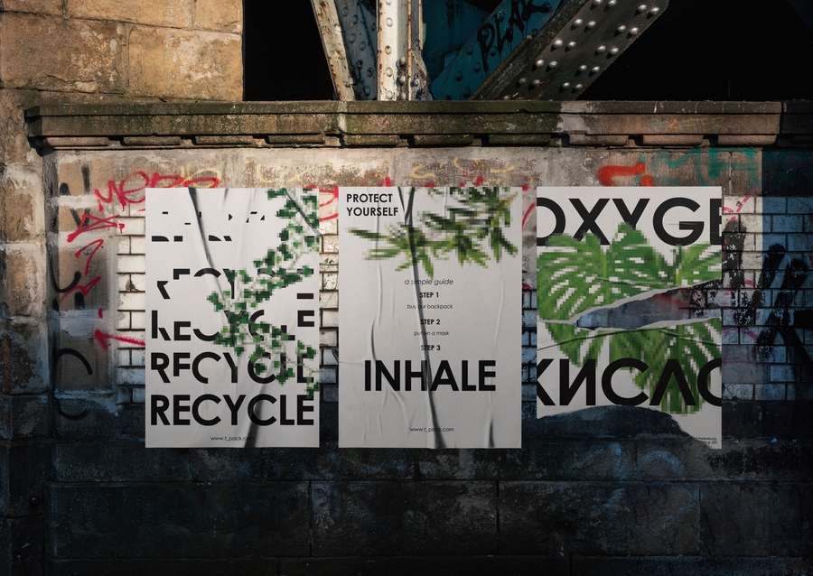 prompt: minimalistic promo poster for T-Pack, a post-apocalyptic company specializing in innovative backpacks for breathing filled with live plants, survival aesthetic, vines and leaves
