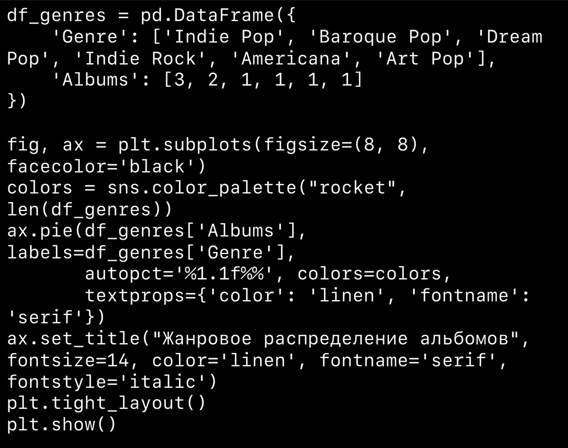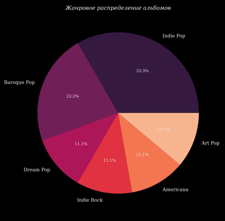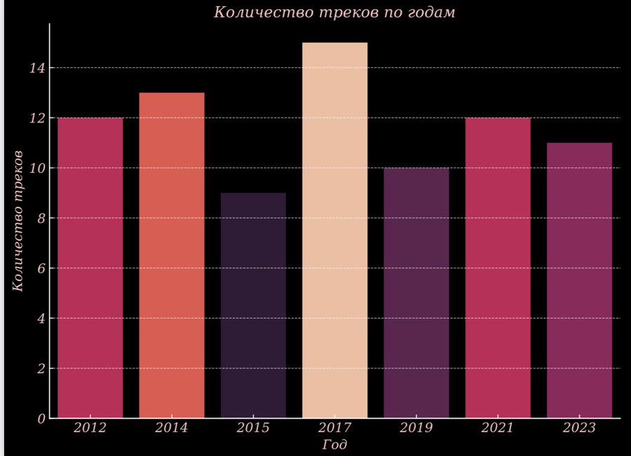 На диаграмме показано в какие годы с 2012 по 2023, ее творчество было наиболее активным. Можно сделать вывод, что 2017 год был наиболее продуктивным. Действительно, эстетика 2017 года хорошо подходила меланхоличной артистке, что и привело к наибольшему количеству написанных треков.