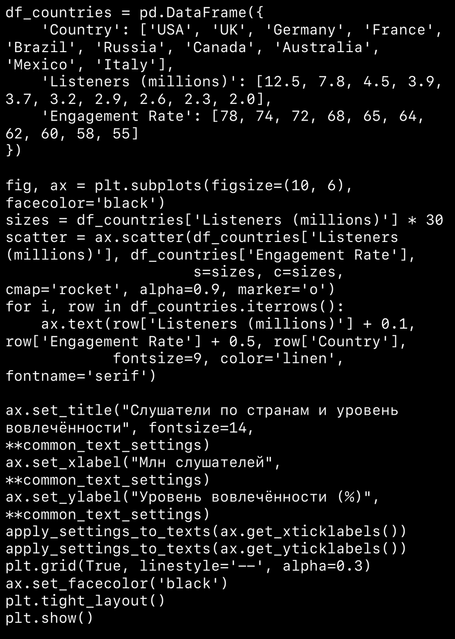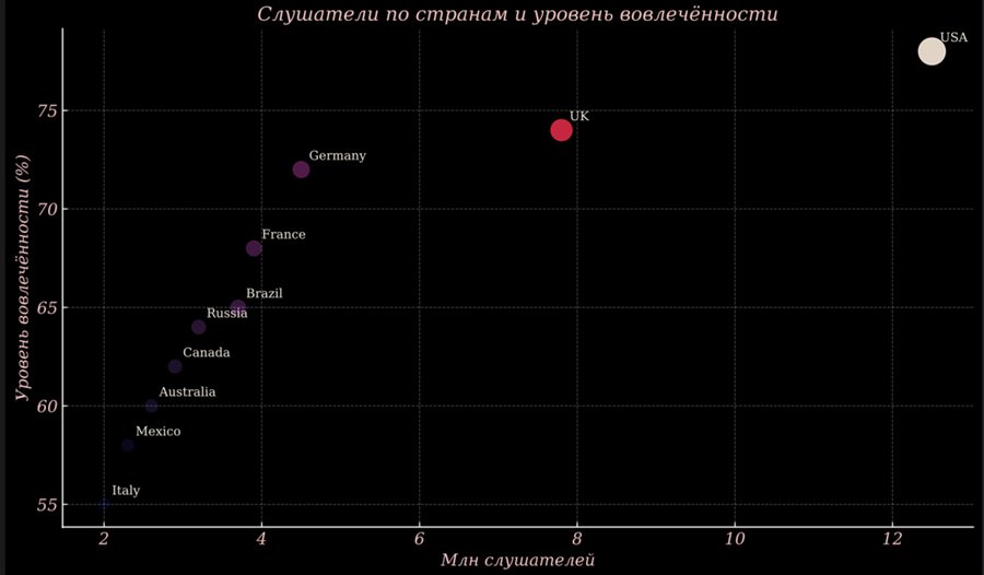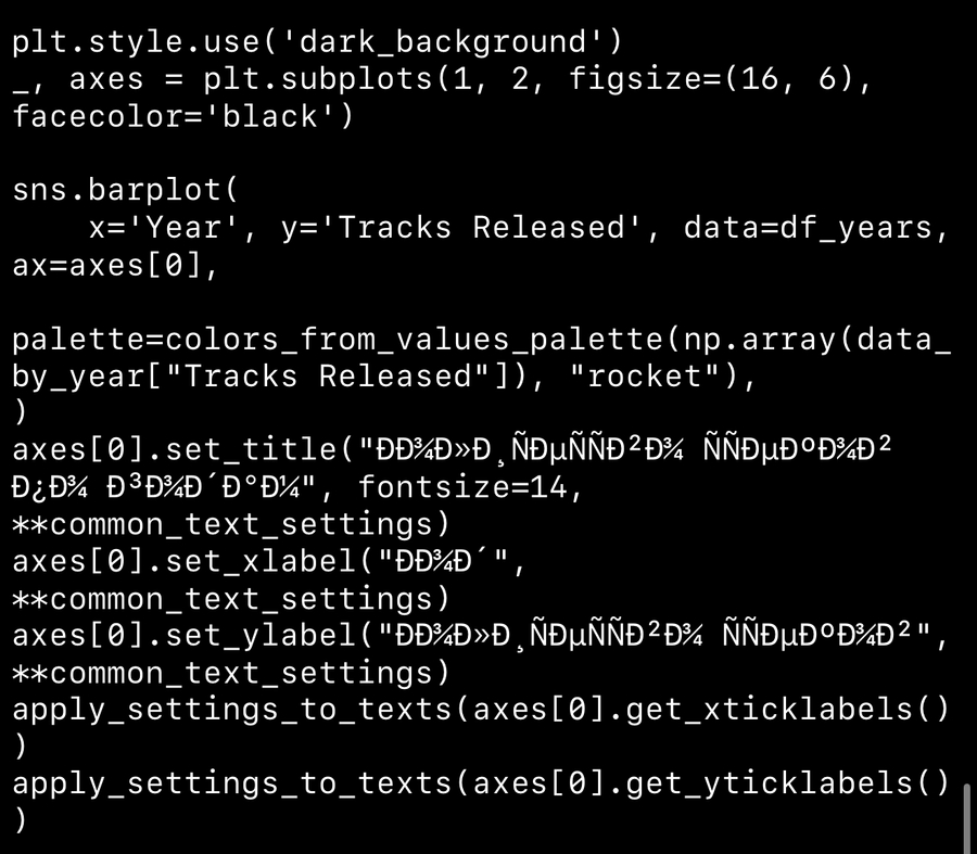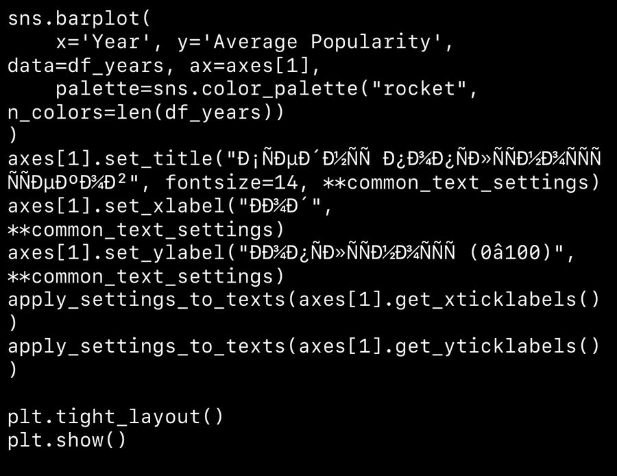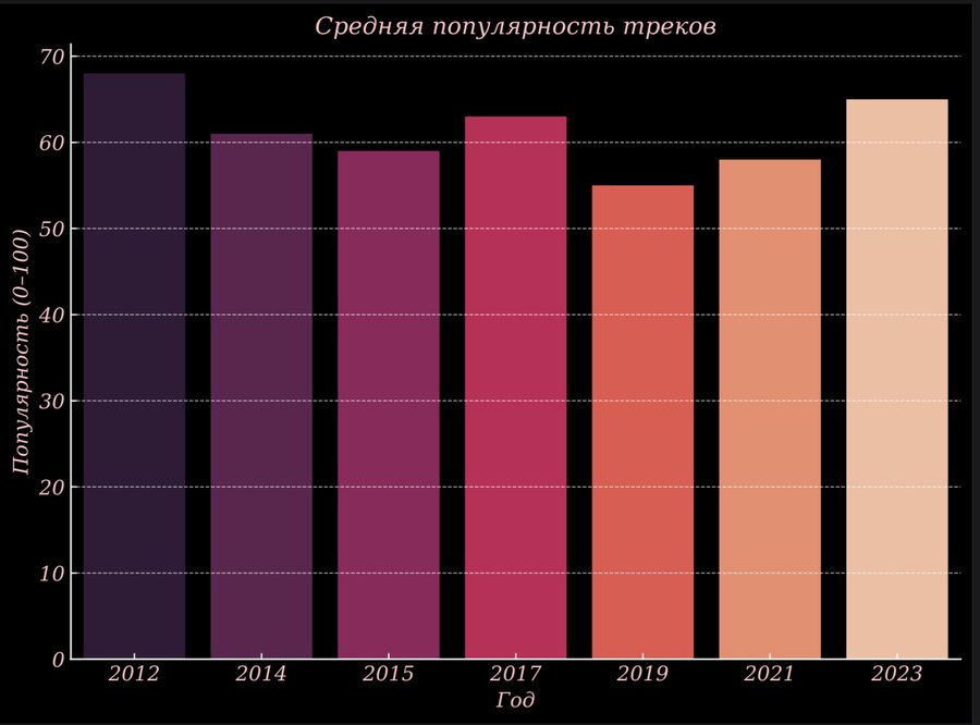 В ходе работы были проанализированы ключевые аспекты музыкальной карьеры Ланы Дель Рэй с помощью визуальных средств и данных из открытых источников (Spotify, Kaggle, Wikipedia). Пик популярности артистки пришёлся на 2012 год, когда вышел альбом Born to Die, давший несколько глобальных хитов. Однако интерес к её творчеству остаётся стабильным до сегодняшнего дня, что подтверждается высокими стримами и активной фан-базой в 2023 году. Жанровое разнообразие артистки проявляется в сочетании нескольких стилей — от indie pop до americana и dream pop. Тем не менее, основное направление её музыки остаётся узнаваемым и стабильным, что очень нравится слушателям из раных стран.