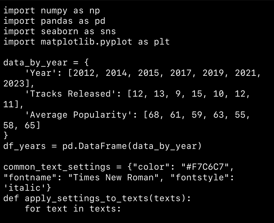 Лана Дель Рей- это псевдоним Элизабет Вуд, американской певицы, композитора и поэтессы, ставшей одной из самых узнаваемых и влиятельных фигур в современной поп-культуре. Ее музыкальная карьера началась в начале 2000-х, но настоящий прорыв произошёл после выхода её альбома «Born to Die» в 2012 году. Лана Дель Рей создала вокруг себя целый мир окутанный меланхолией, ностальгией и голливудским гламуром. Музыка Ланы это кинематографичный саундтрек к жизни, где каждый трек- история, наполненная образами и, смотря на винтажное звучание, она остается популярной по сей день. Мне стало интересно сделать визуализацию анализа музыки этой исполнительницы, ведь я являюсь частым слушателем и вдохновляюсь ее творчеством.