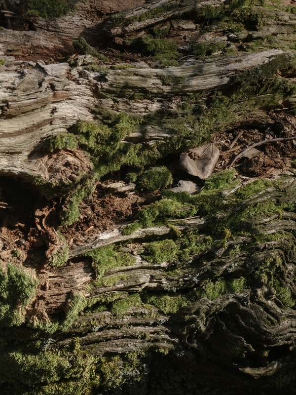 雨后土地潮湿,我与老树枯木浸泡同一片暖阳,枯木倒下,被大片苔藓覆盖,生命却从未终止。阳光穿过树叶间隙细碎洒落在苔藓上,渺小不起眼却有着无限生机。