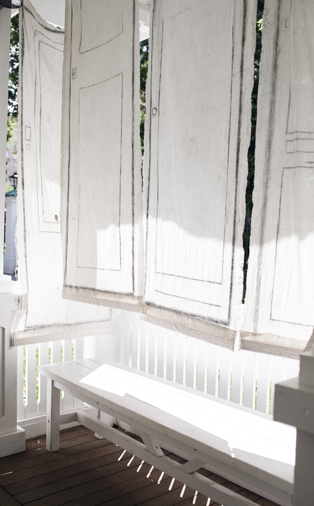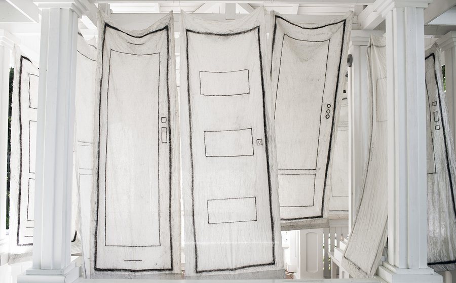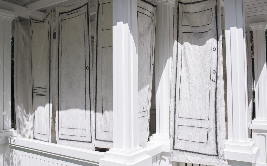 Инсталляция составлена из 19 накрахмаленных тканевых полотен-дверей, сделанных по размеру окон в беседке. Помещая условные двери, отсылающие к частному, художница уподобляет беседку коммунальному пространству. Это место, где сливается личное и общественное одновременно. Изменённое пространство начинает казаться наполненным и многолюдным, составленным из многих индивидуальностей, что отражено в вариативности эскизированных дверей