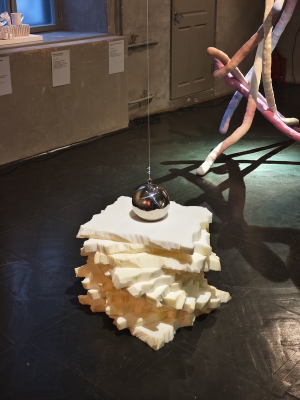 Объект демонстрирует автоматизм, работу неодушевленных систем. Это олицетворение безжалостности хода жизни. При этом в форме паралона отражена красота хаоса человеческих эмоций. То, что и делает нас живыми. Поэтому на контрасте с рваной формой выступает зеркальный шар. С гладкой текстурой, с точным таймером и просчитанным движением. Вечное непринятие фатализма толкает людей искать способы задержать время и перенести прошлое в настоящий момент. Но механизм жизни не терпит случайности вне своей программы. Или это все же иллюзия?