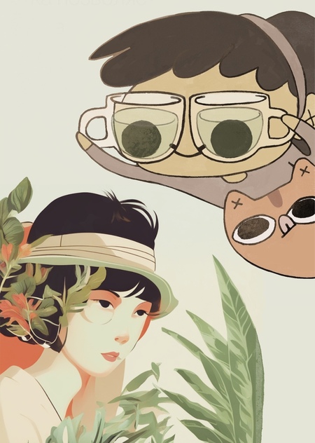 — Poster for a tea Chinese company, a woman in a hat is surrounded by plants in jungle, a digital painting, inspired by Itō Shinsui, chinese painting style, digital painting, artwork in the style of guweiz