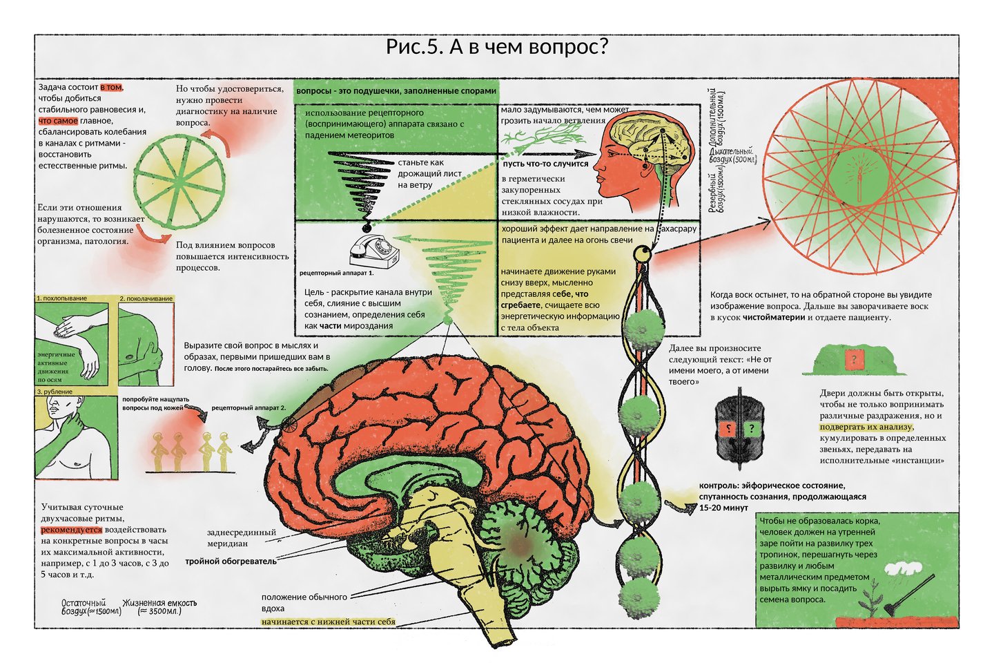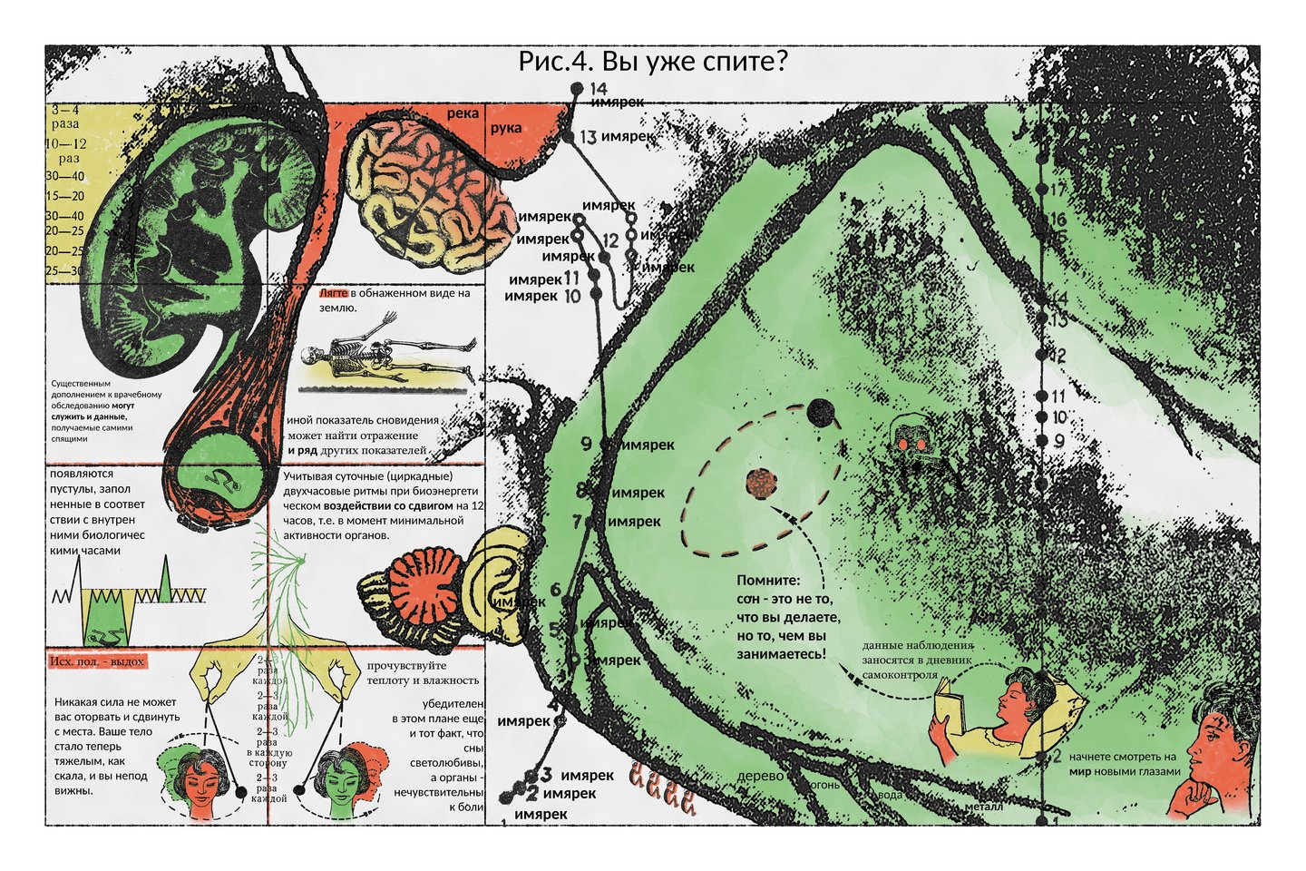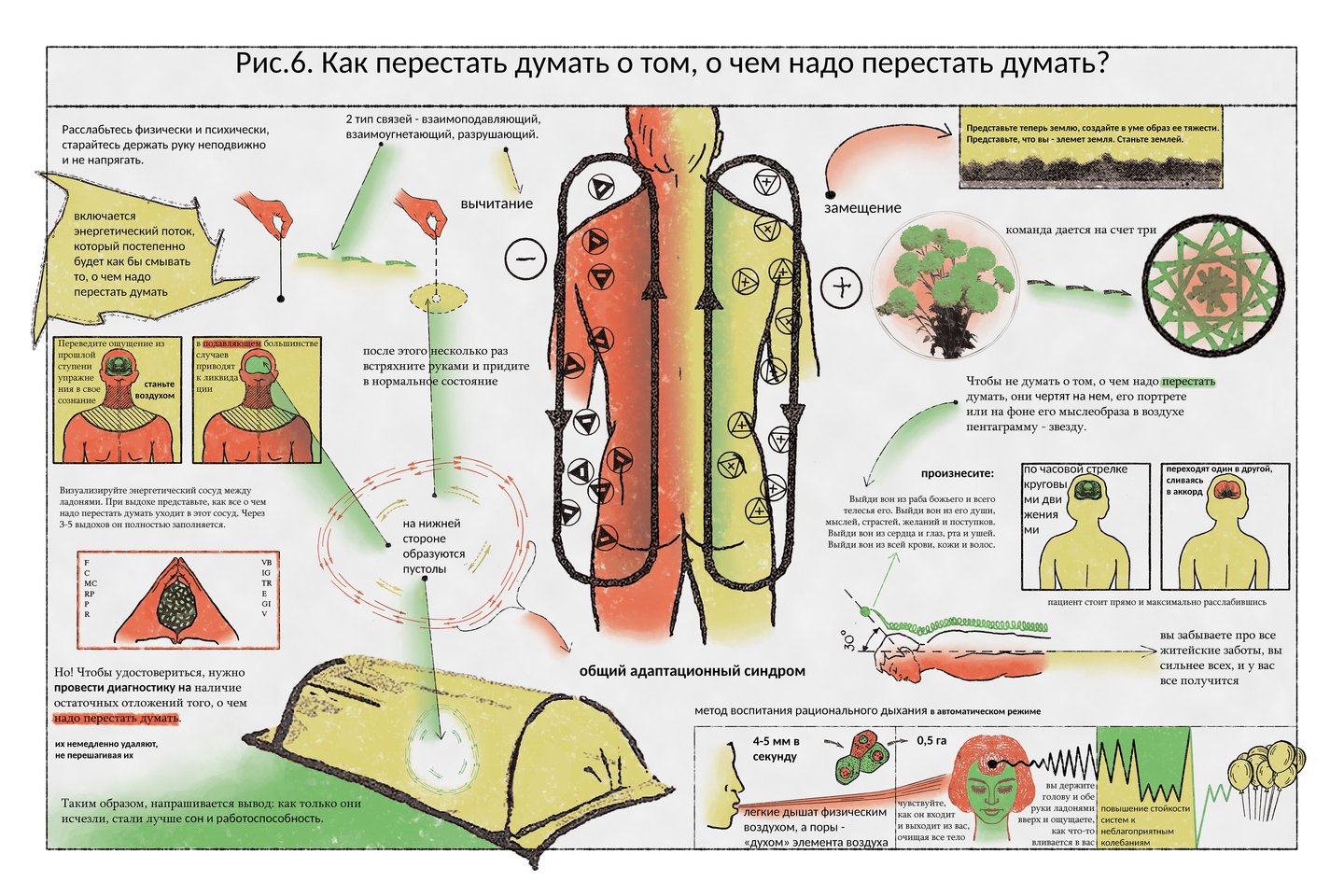 Смешивая иллюстрации и тексты из найденных изданий, я создаю абсурдные схемы. В основу схем ложатся сложные иррациональные вопросы, зачастую не имеющие ответов. Этим актом я подчеркиваю невозможность рационализации всех аспектов жизни. Я также рассуждаю о комплексности реальности, ее сложности и запутанности. В условиях постоянно множащегося потока информации, люди пытаются разобраться в происходящем, прочерчивая запутанные связи между отдельными явлениями. В своем стремлении упорядочить реальность, они упрощают то, что по сути своей сложно, объясняют то, что не объяснимо, теряя в процессе суть явлений. Результатом этих попыток становятся абсурдные инструкции, не имеющие отношения к сути вещей. Именно этот зазор между действительностью и инструкцией к ней я и исследую в своем проекте.