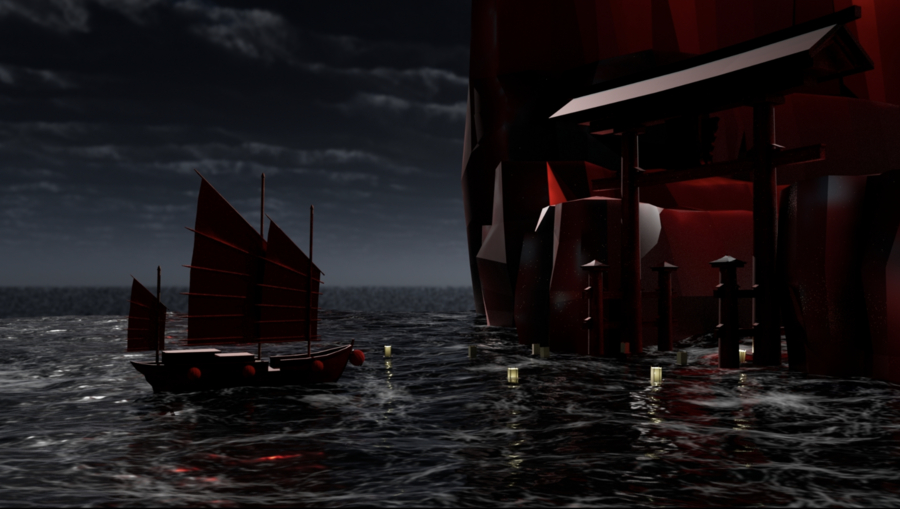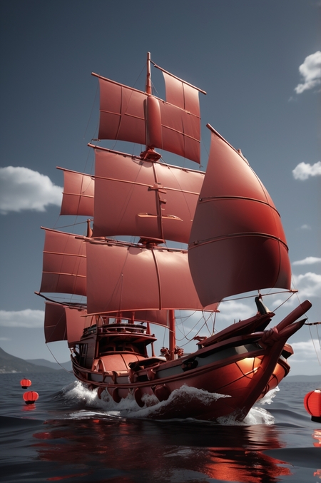 Промт: «A junk boat with red sails and red Japanese lanterns sails up to the Tori Gate on Ruby Island»