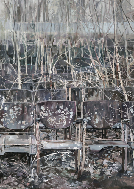 The Green Theater at VDNKh was a cult place at Soviet times. In the 1930s, the Kolkhoz theater performed there, in the 1980s people can visit there rare jazz and rock concerts. By the 2000s, the place was abandoned and forgotten. Young trees have sprouted through auditorium armchairs. If we remember decodings of speeches from sessions of the Central Committee of the CPSU which have been printed in Soviet newspapers, they remind us theatrical plays — here and there in the end of phrases in brackets there were notes «tumultuous applause», «prolonged applause» — hence the name of this painting.