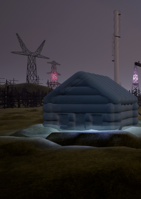 Локация «Неодеревня»: Мягкие дутые избы в лесном пространстве, состоящем из объектов электроснабжения