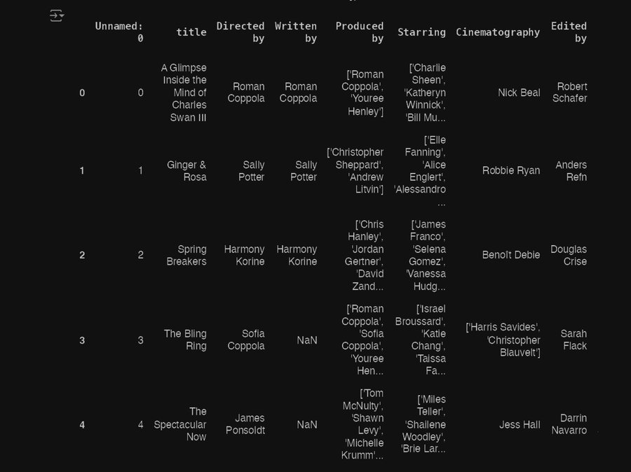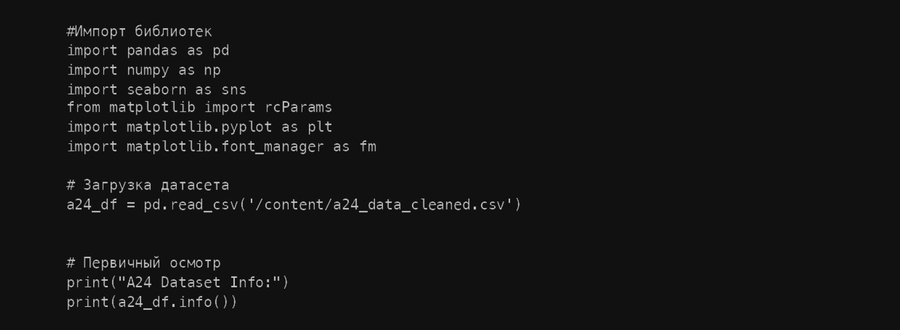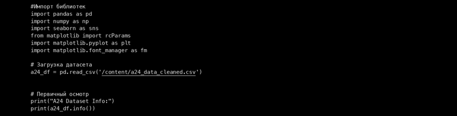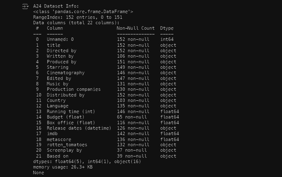 Для начала я загрузила все необходимые библиотеки и датасет с фильмами студии A24 в формате CSV с помощью Pandas. После этого я изучила структуру данных: посмотрела названия столбцов, типы данных и количество пропусков.