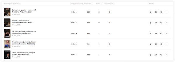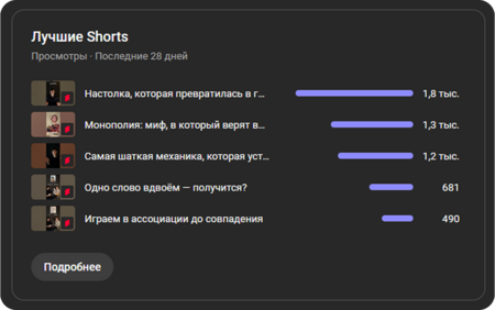 Серии коротких роликов были опубликованы одновременно на TikTok и YouTube Shorts. Тематика касалась настольных игр в целом. Всего было снято 5 роликов. Отдельный интерес представляет ролик «Играем в ассоциации до совпадения», который получил наибольшее вовлечение по лайкам при средних просмотрах, что может свидетельствовать о попадании в интерес конкретной аудитории.