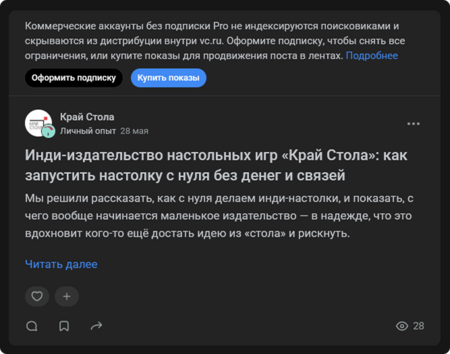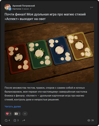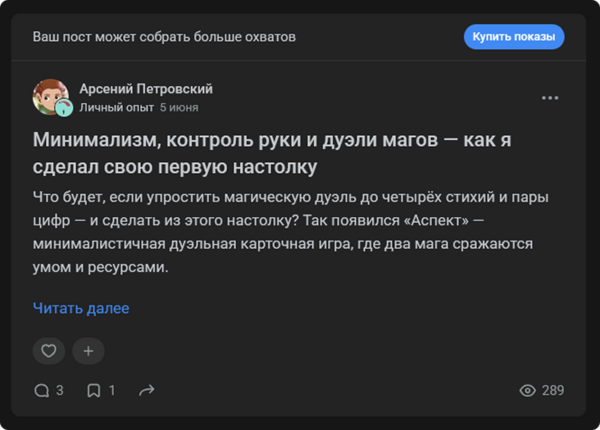 В итоге vc.ru — статья получила 286 показов в ленте и 40 открытий поста. DTF — публикация на тему дуэльной игры «Аспект» получила 1980 показов и 134 открытия поста. Публикации в текстовом формате демонстрировали гораздо большую органику за счёт алгоритмов платформ.