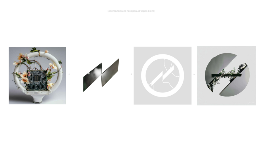 Для создания логотипа я загрузил в MidJourney несколько образов, подходящих для будущего лого, а также основной референс ({ref}) и скомбинировал их с помощью функции «бленд»