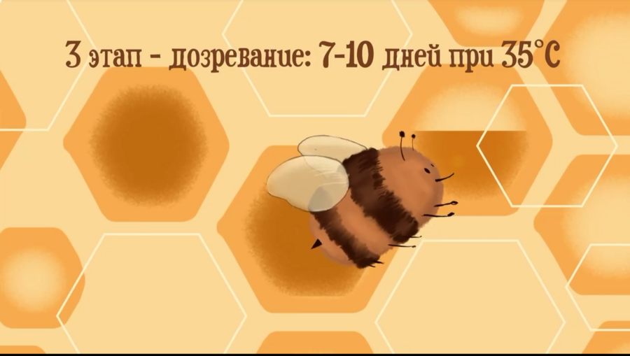 Первая часть ролика посвящена рассказу о процессе создания мёда пчёлами.