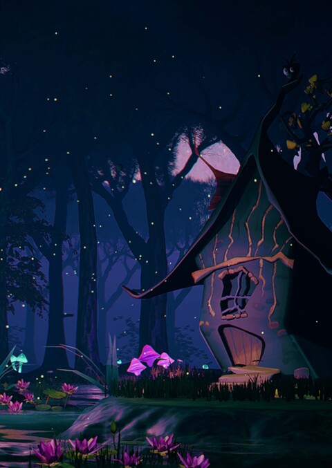 Основной задачей было поставлено: воссоздать ощущение магии в ночной чаще. Обитатель тайного места — лис, который передвигается по реке на большом листе дерева.