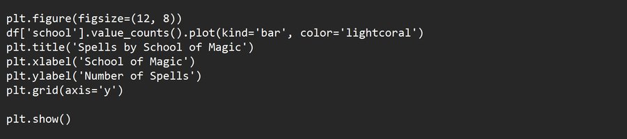 промпты (ChatGPT): — create a pie chart with Matplotlib showing the number of spells in each school of magic.