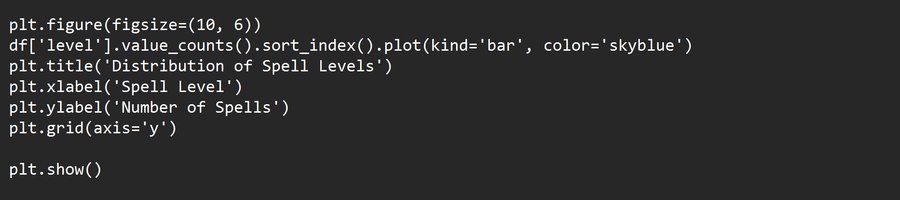 результат: — Here are some potential plots we can create: 1. Distribution of Spell Levels: A bar chart showing the number of spells at each level. 2. Spells by School of Magic: A bar chart showing the number of spells in each school of magic. 3. Spells by Casting Time: A pie chart showing the proportion of spells by casting time. 4. Components Required for Spells: A set of bar charts showing the number of spells requiring verbal, somatic, and material components. 5. Spells by Class: A bar chart showing the number of spells available to each class.