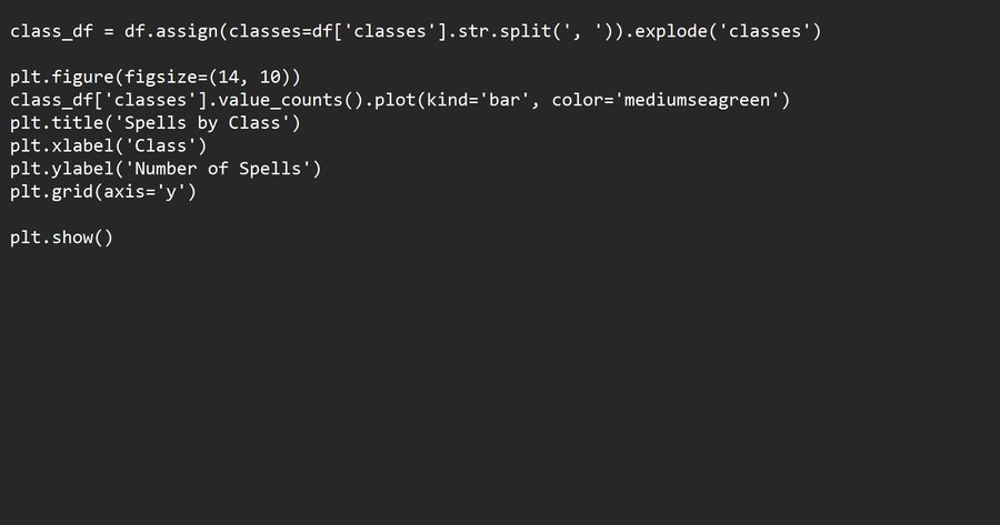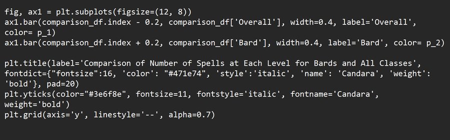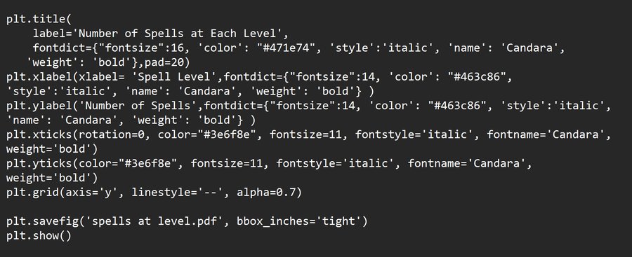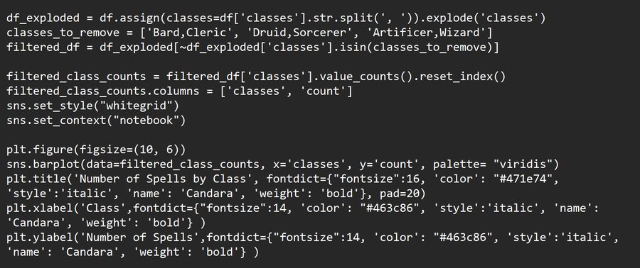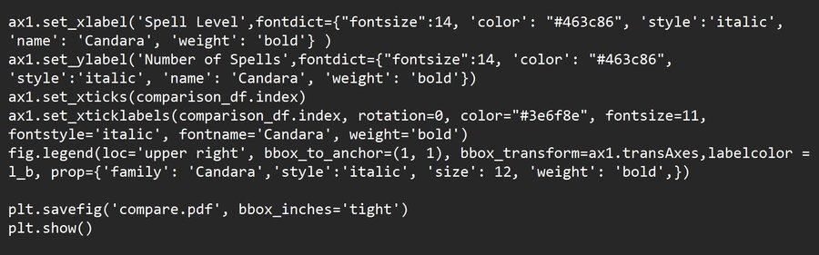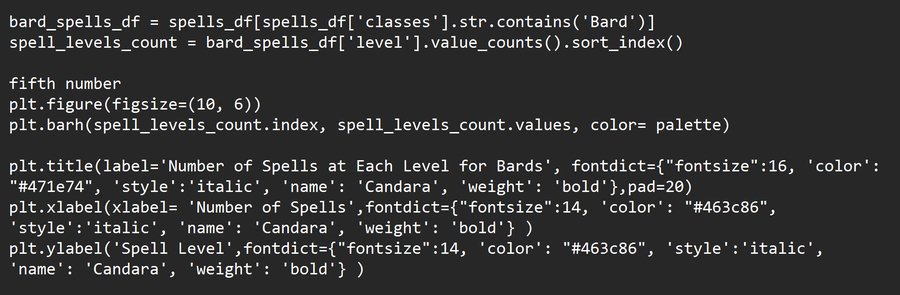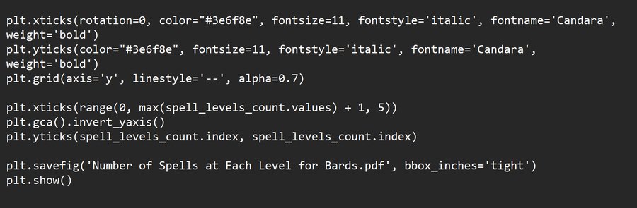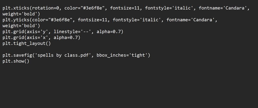 Одна из самых больших дилемм в «D& D» — это то, за какой класс тебе выбрать играть. У каждого класса есть свои особенности и задачи, и кто-то любит больше сосредотачиваться на грубой силе и физических навыках, а для некоторых важно иметь возможность использовать разнообразные комбинации заклинаний, изучая их требования и эффекты. Чтобы помочь кому-то (мне) с определением выбора, я решила, что одной из самых важных задач является сортировка заклинаний по их классам. К изначальному коду, который я показывала на этапе разработке добавилась сортировка классов, чтобы исключить слипшиеся варианты. Также через matplotlib я нашла способ узнать доступные шрифты из моего компьютера (matplotlib.font_manager.get_font_names ()), один из которых в дальнейшем я использовала для оформление всех графиков. Я изменила не только шрифт, но и его жирность, размер и окрас. Проделала я это для каждого элемента графика, чтобы они сочетались между собой. Также в конце каждого кода я добавляла строку, которая в последствии позволила мне экспортировать полученный результат в формате pdf, чтобы не терять качество.