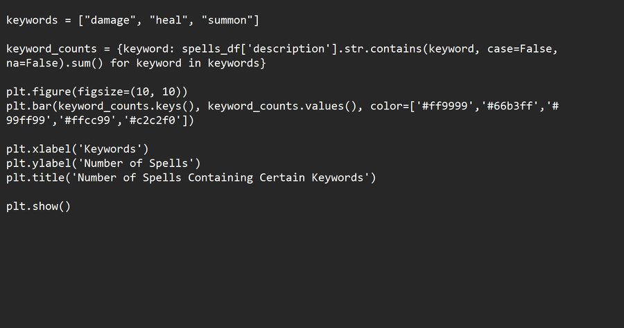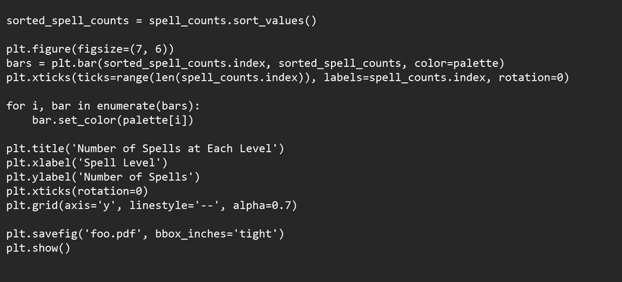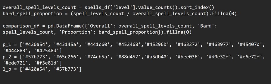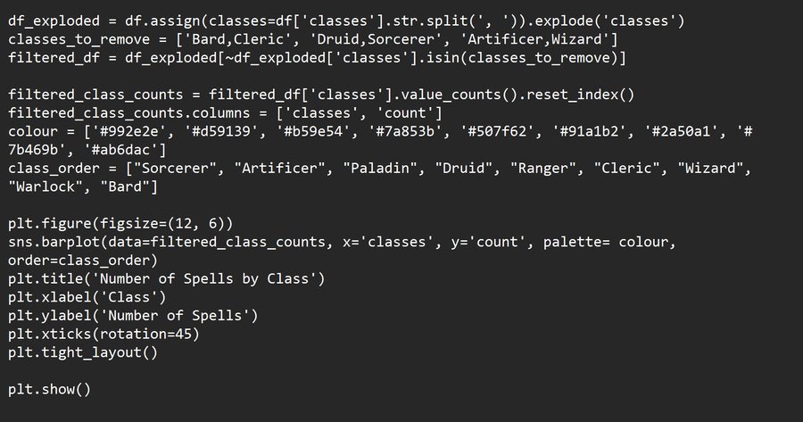 График, который я точно хотела включить в свой финальный вариант, являлся количество заклинаний, доступное для разных классов «D& D». В изначальной версии кода, который мне предоставил ChatGPT по какой-то причине происходила проблема в сортировке, где некоторые классы слипались в один. Я попробовала убрать данную ошибку и параллельно с этим начала думать над будущей стилизацией. У официального источника «D& D» есть персональные цвета для каждого из классов, поэтому первой моей идеей было взять именно их за основу визуала. Так я использовала кастомные цвета, я также отсортировала каждый класс, чтобы он соответствовал своему оттенку.