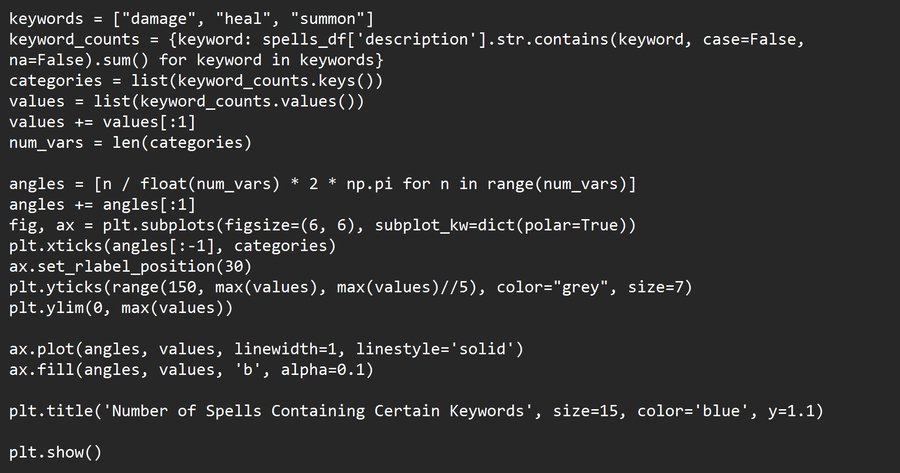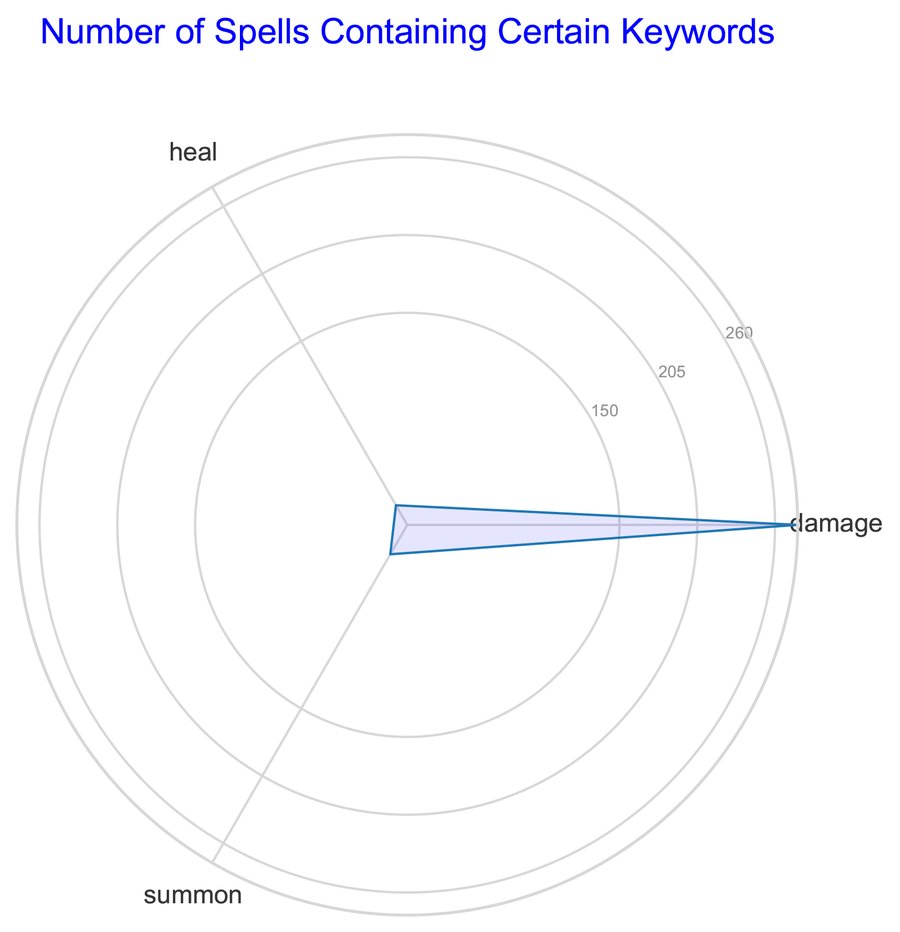 промпты (ChatGPT): — create a bar chart showing the number of spells containing certain keywords in their descriptions (e.g., «damage», «heal») — create a spider plot for the same thing