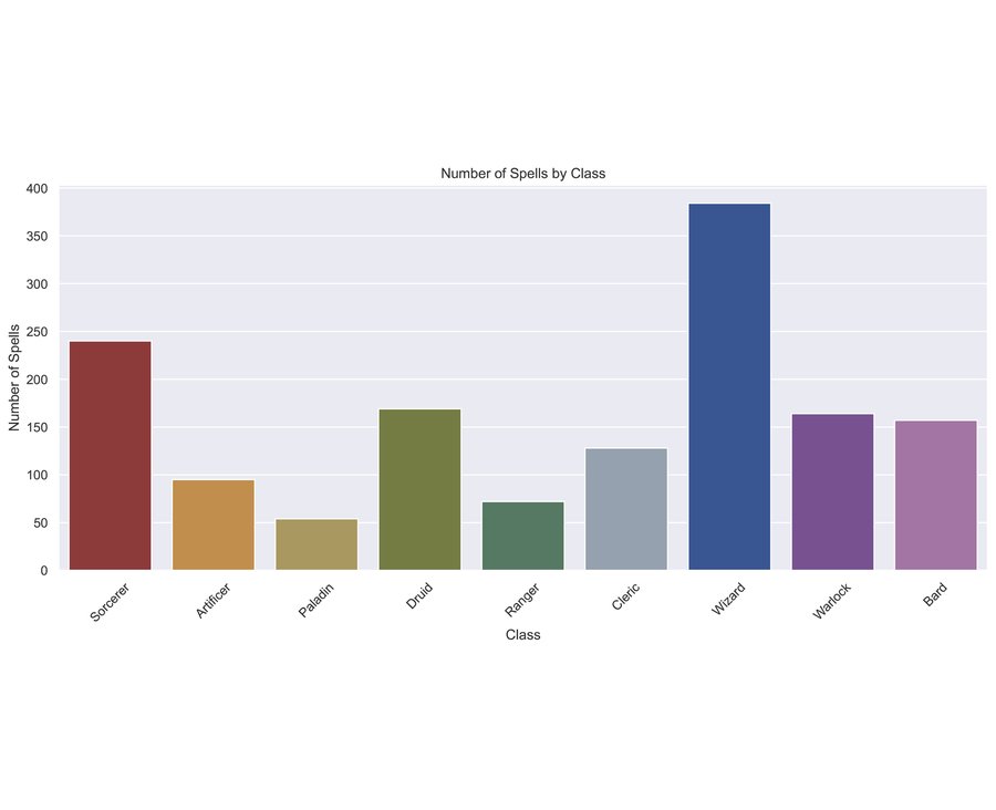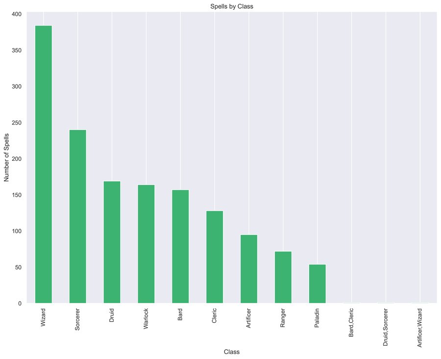 Через данную гистограмму можно легко сориентироваться в игровых классах и сколько заклинаний доступно для каждого из них (за исключением классов, у которых в целом отсутствует возможность использовать магию). Так, например, для игроков, которые хотят полностью погрузиться в магический мир, идеальным классом будет волшебник, которому доступны больше две третьих всех заклинаний. Для сбалансированного использования и магии и оружия лучше всего подойдет бард или же жрец, которые хоть и полагаются на спеллкастинг, но при этом все еще имеют и хорошие модификаторы для ведения ближнего боя. Для тех же, кто хочет в основном играть за персонажа с грубой силой, но все еще иметь возможность использовать заклинания хорошим выбором будет паладин.