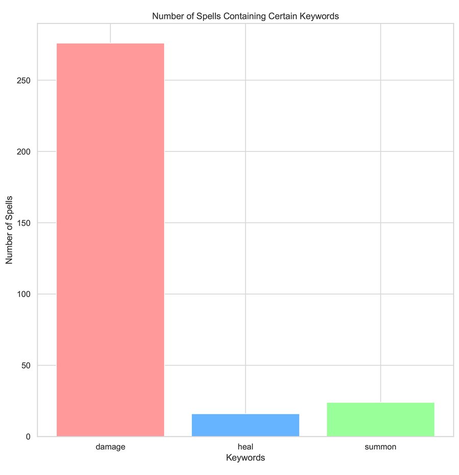 Также из доступных мне данных я думала создать гистограмму, а в последствии лепестковую диаграмму, которая отображала бы данные о специфике каждого заклинания — является ли оно враждебным, целебным или призывающим. Но после того как я получила свой результат, я поняла, что из-за огромной диспропорции в количестве, графики выглядят скорее нелепо, и даже стилизация их бы не спасла.
