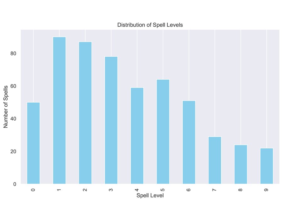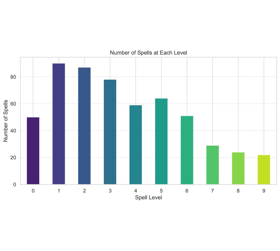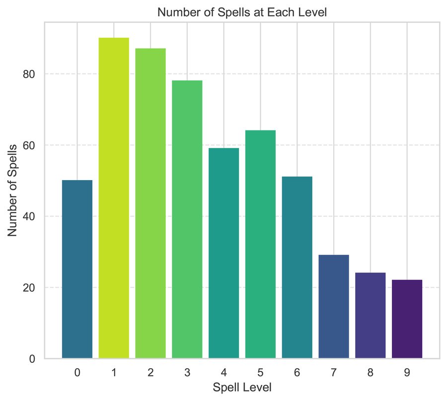 Гистограмма с количеством заклинаний на каждом уровне показывает почти что прямую тенденцию с понижением количества с увеличением уровня. Так как нулевой круг, это заговоры, которые не требуют ячейки заклинаний для их сотворения, их количество значительно меньше того же первого, второго и третьего круга. При этом что удивительно на четвёртом уровне заклинаний меньше чем на пятом, хотя до этого их количество только уменьшалось. Между шестым и седьмым уровнем есть достаточно большой скачок между количеством, и дальше заклинаний становится только меньше.