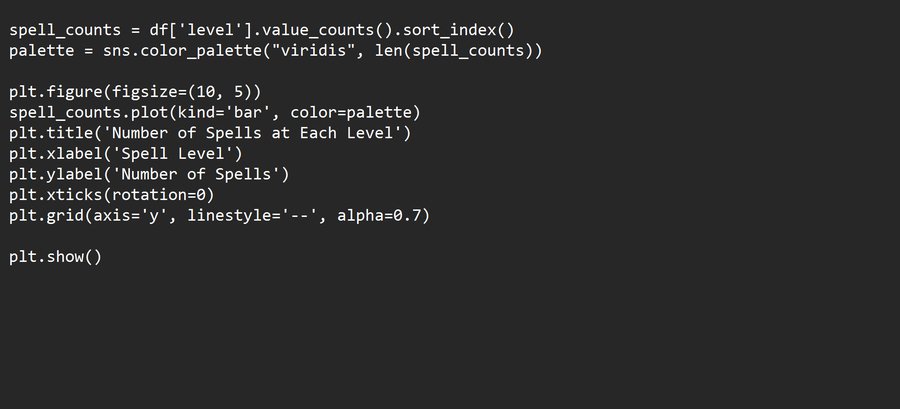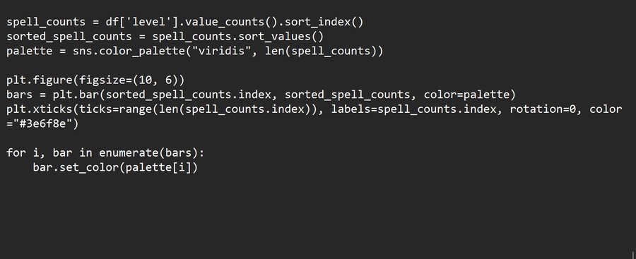 Мне не очень сильно понравилась изначальная палитра, так как в ней было очень много грязных цветов. Я пошла на сайт seaborn, чтобы посмотреть какие возможные палитры существуют в библиотеке, и наткнулась на палитру viridis, которую использовала в дальнейшем для всех графиков. В нужные цвета я привела и график количества заклинаний по классу, и график с данными о количестве заклинаний на каждом уровне. При этом вторую гистограмму я решила слегка разнообразить, так как изначально у меня в очередной раз получался один и тот же градиент слева на право. Поэтому я попросила ChatGPT помочь мне распределить цвета на графике от наибольшего значения к меньшему.