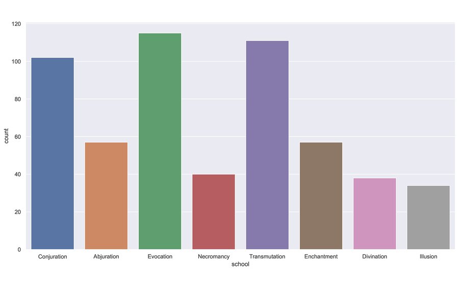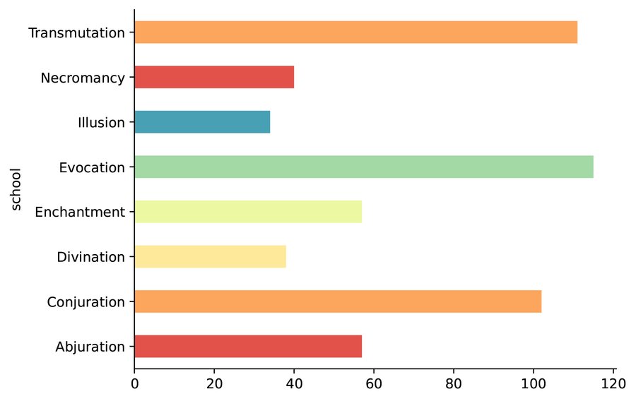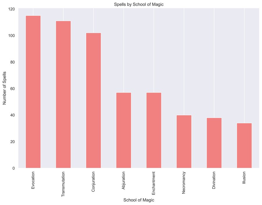 Данная диаграмма позволяет понять распределение заклинаний по разным школам. Чтобы действительно понять этот график, нужно знать кая школа отвечает за какие заклинания. Так, например, наибольшее значение заклинаний приходится на воплощение, которая отвечает за все-возможные взрывы и манипуляции энергией. Из следующих данных можно смело сказать, что больше всего заклинаний в «D& D» являются враждебными, направленные на причинения вреда. Недалеко ушла и школа преобразования, которая помогает буквально преобразовывать мир вокруг персонажа, добавляя ему различные бонусы, такие как полет. На третьем же месте находится призыв, который позволяет вызывать существ и предметы из других измерений.