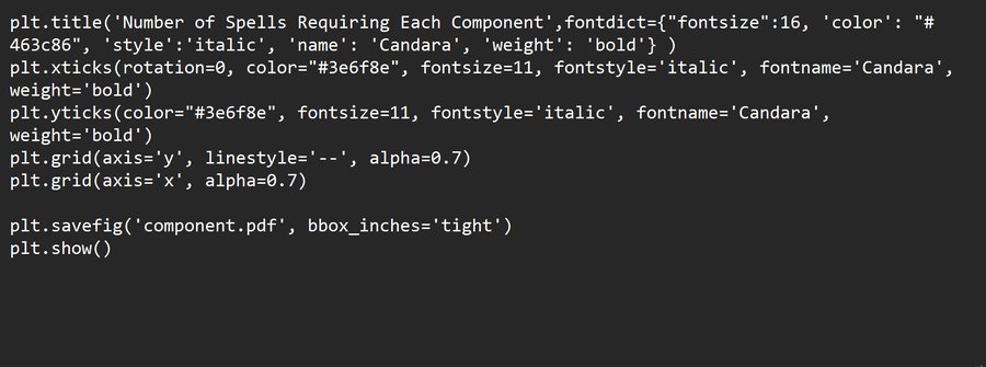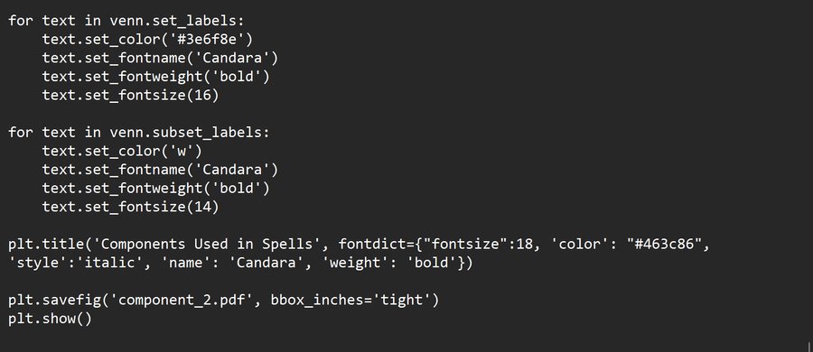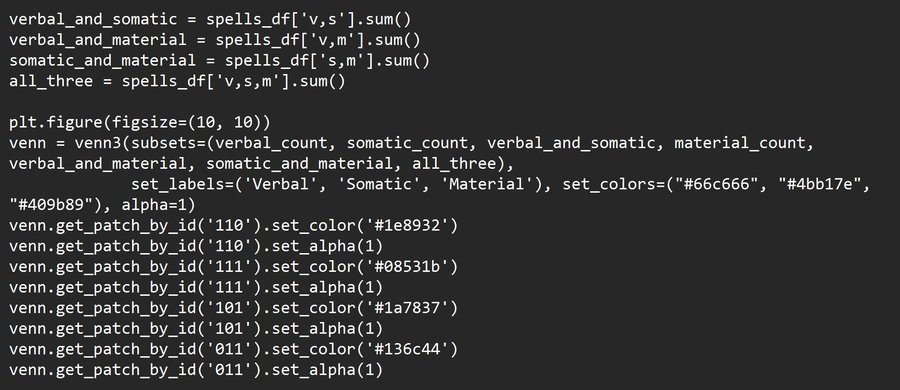 Следующие два графика показывают количество различных компонентов, которые требуются для заклинаний. Мне хотелось не только показать частоту использования отдельных элементов, но и то, как часто они используются одновременно, так как я знаю, что во многих заклинаниях нужен больше чем один компонент. Для того, чтобы сделать это в изначальную таблицу я добавила четыре новых столбца, каждый из которых отвечает за совместное использование элементов. Однако после того как я получила свою гистограмму я поняла, что она не совсем точно отображает данные, и наверняка есть способ их представить в другом, более читаемом виде. Для этого я пошла на сайт Python Graph Gallery, который содержит в себе информацию по всевозможным графикам для питона и, что более важно, то, как правильно написать код. На этом сайте я нашла диаграмму венна, которая идеально подходила для моей задачи. Для изменения цветов внутри графика я вновь воспользовалась помощью stackoverflow.