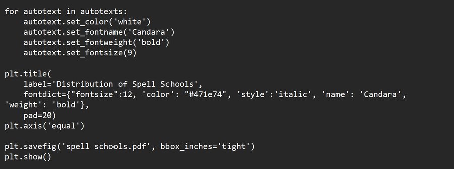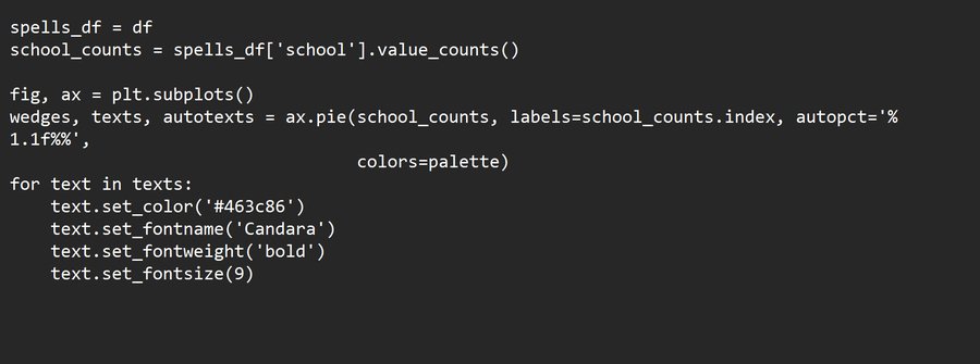 Изначальную гистограмму со школами заклинаний я решила преобразовать в круговую диаграмму, чтобы разнообразить типы визуализации данных. И благодаря этому я поняла, что до этого задумывалась исключительно о цветовой части графиков. Однако одной из самых важных частей диаграмм является текст, и именно с ним у меня возникла проблема. На круговой диаграмме черный шрифт поверх выбранного мной стиля был нечитаемым. В дальнейшем я использовала функции стилизации текста для приведения графиков к финальному виду.