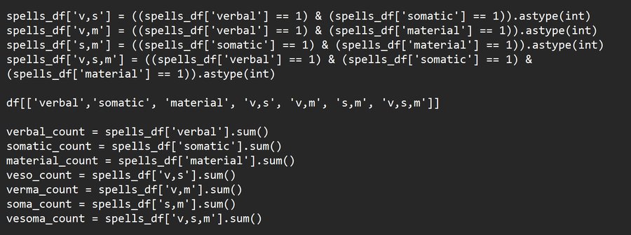 Еще одним элементом таблицы, который я хотела проанализировать, являлись компоненты заклинаний (вербальный, соматический, материальный). Получив таблицу, я поняла, что она не совсем точно отображает действительность, так как некоторые заклинания требуют в себе сразу несколько компонентов. Это я в дальнейшем исправила на финальных графиках.