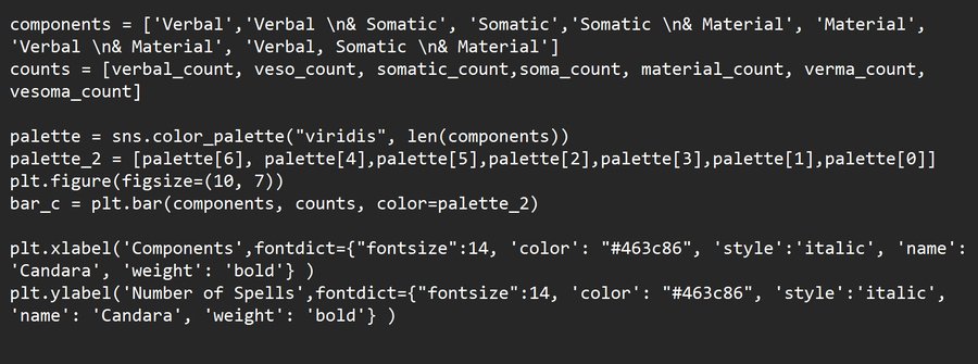 промпт (ChatGPT): — create a code from a file for a set of bar charts showing the number of spells requiring verbal, somatic, and material components