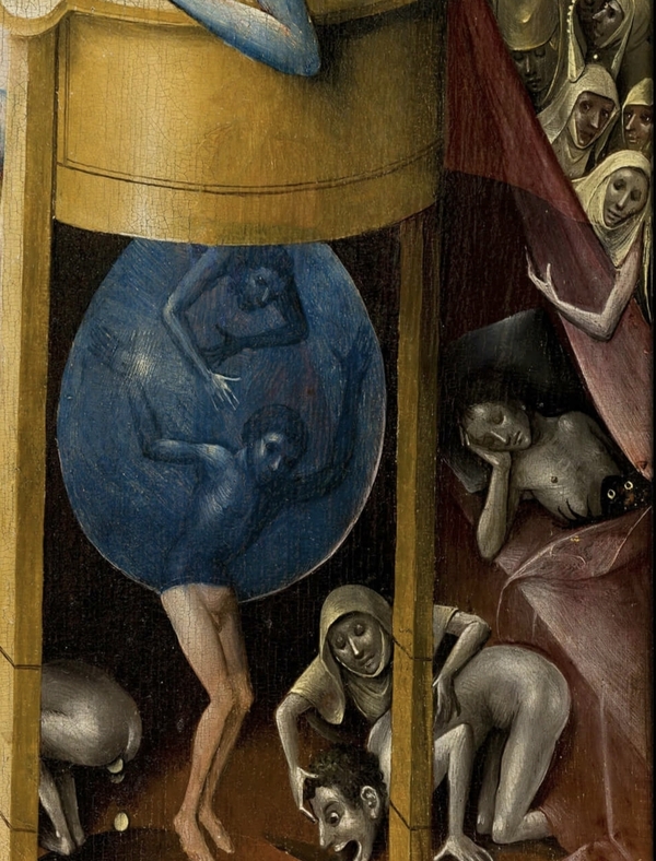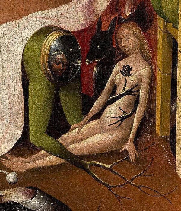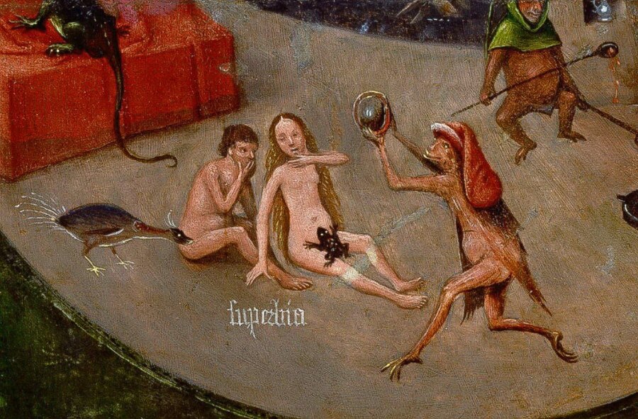 На картинах " Семь смертных грехов и четыре последние вещи» и " Сад земных наслаждений " изображены женщины, во власти дьявола, метка греха в виде жабы располагается на телах несчастных.