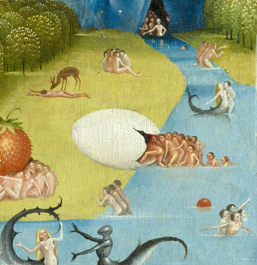 На картине " Сад земных наслаждений " на основной створке изображено треснутое яйцо, во внутрь которого заходит толпа людей, это может символизировать зарождение греховности в земном «раю».