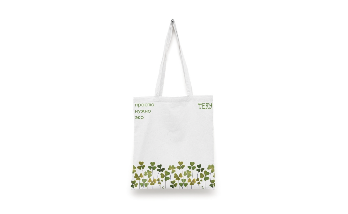 // a shopper bag with the name of an eco-friendly powerbank company called TERY. the company’s colors are green, red, blue and white. the name of the company should be green