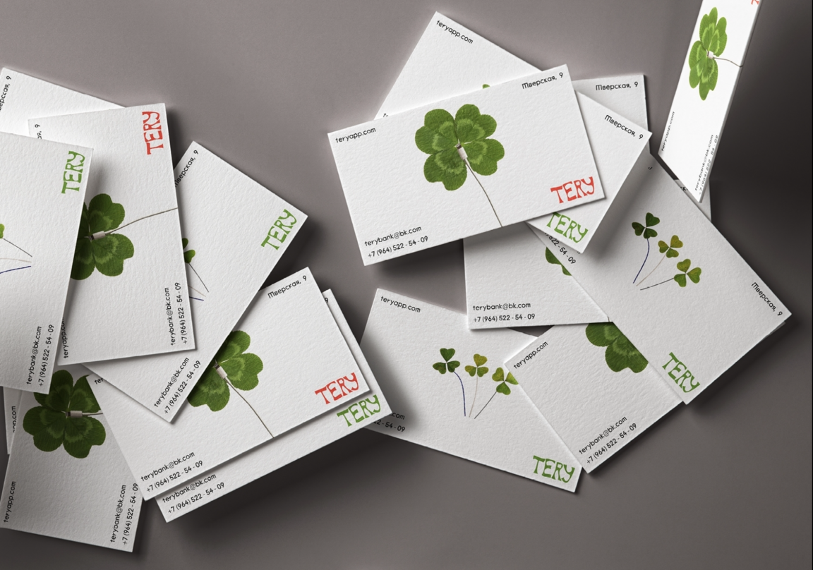 // a business card with the name of an eco-friendly powerbank company called TERY. the company’s colors are green, red, blue and white. the name of the company should be green. there should be contact information on the business card