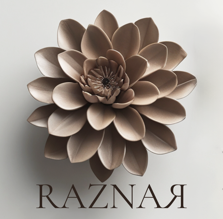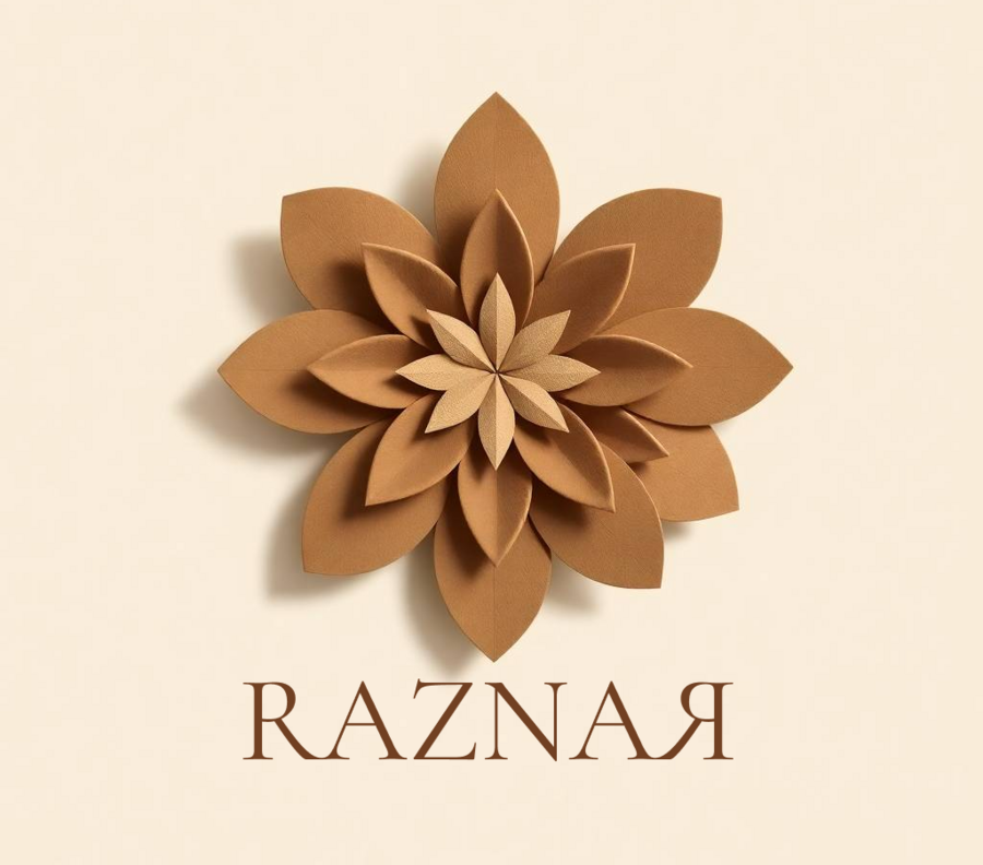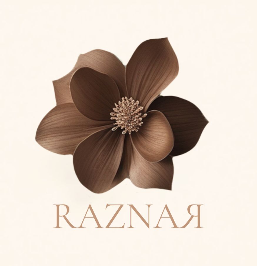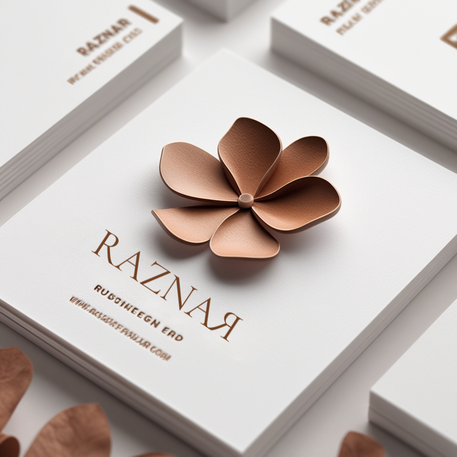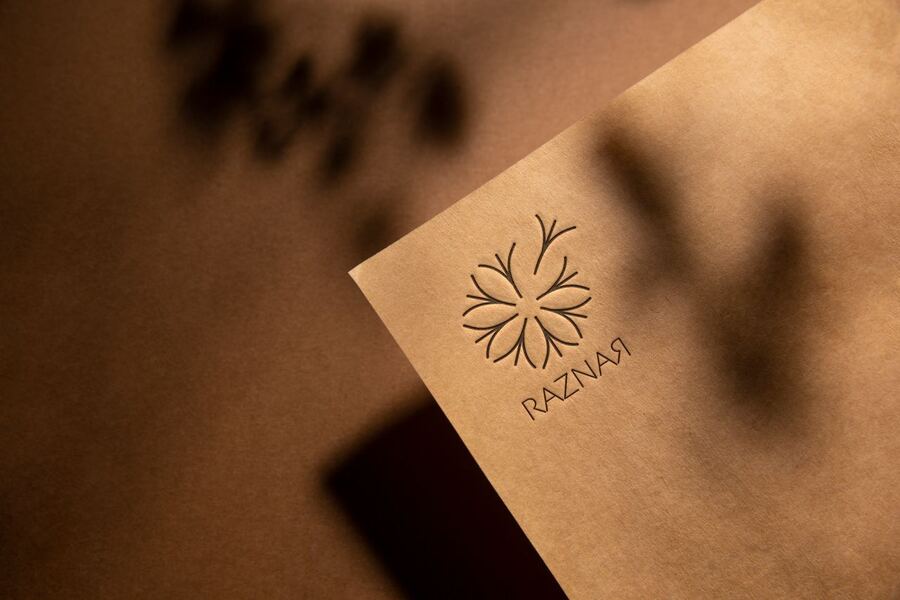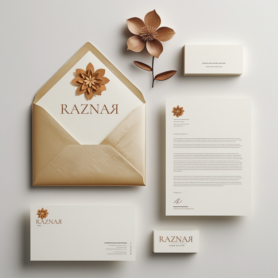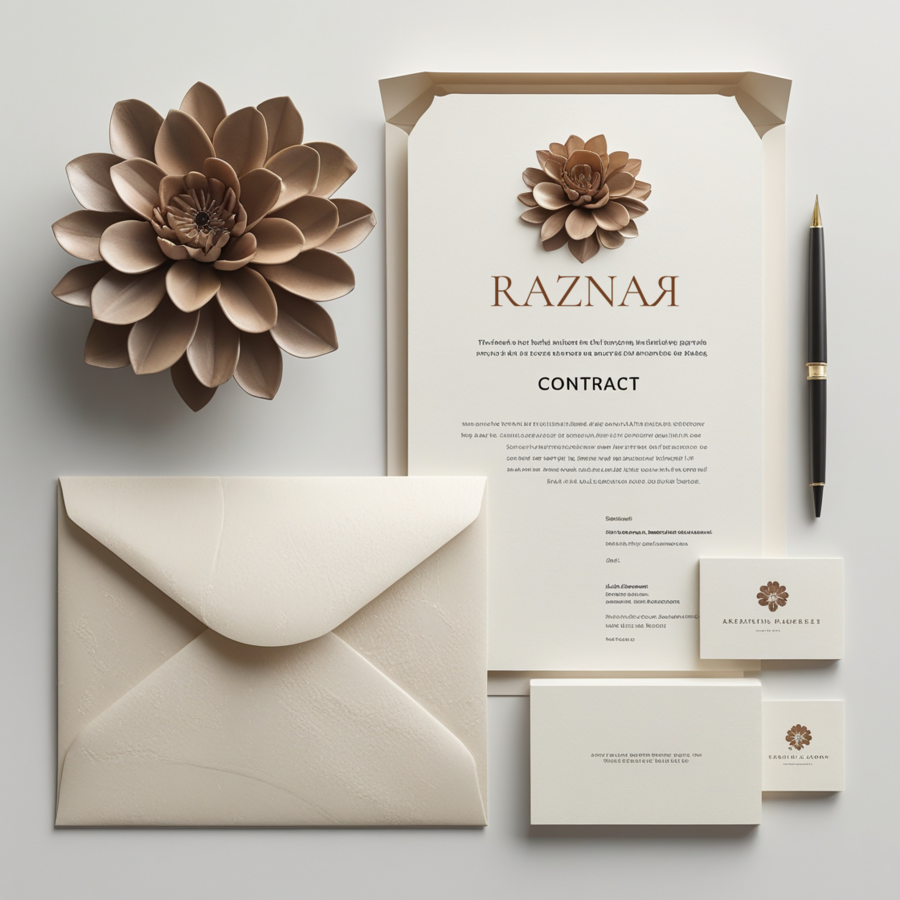 Промт: create printed documentation: contract, envelope, business cards on a white background for the RAZNАЯ brand, women’s space, above the name there is a flower logo in brown tones