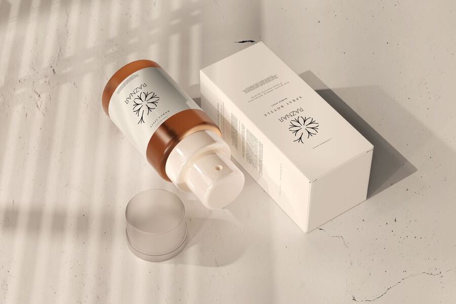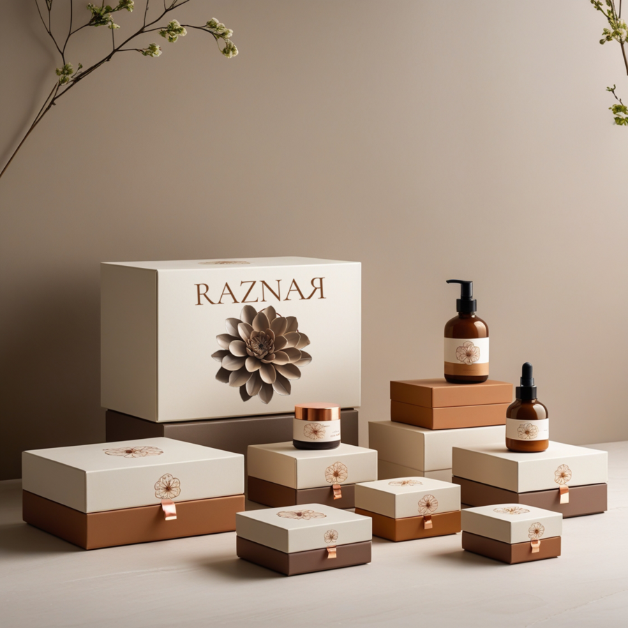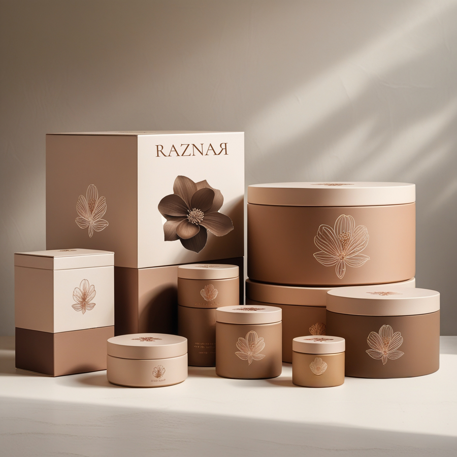 Промт 1: we create boxes for women’s cosmetics from the women’s space «RAZNАЯ», which sells natural cosmetics in brown tones with a flower logo